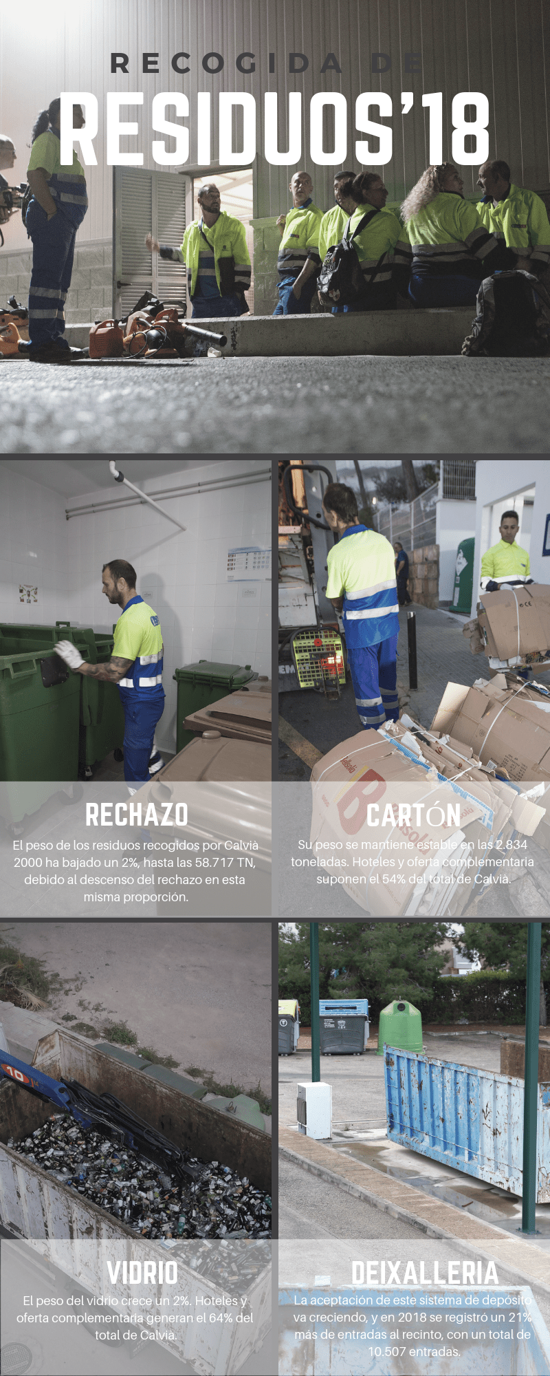 El peso de los residuos recogidos por Calvià 2000 a lo largo del año 2018 ha bajado un 2% respecto al año anterior, hasta alcanzar las 58.717 toneladas, debido al descenso del rechazo en esta misma proporción. En cuanto a la recogida selectiva (vidrio, cartón, envases, orgánica, ropa y aceite), ha incrementado su participación en el total de los residuos del municipio, pasando del 23,98% al 24,38%.