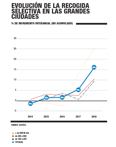 La recogida selectiva municipal de papel y cartón en las grandes ciudades españolas crece por cuarto año consecutivo y lo hace con un 16,6% de incremento medio para las ciudades de más de cien mil habitantes con respecto al año anterior. Un crecimiento muy superior al incremento del consumo de papel, que fue de apenas el 2%.