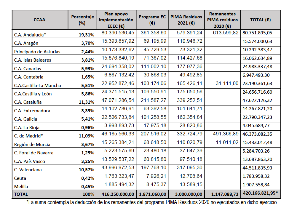 En la reunión también se ha comunicado a las CCAA la distribución de las subvenciones dirigidas a financiar inversiones en materia de gestión de residuos por importe de 421,12 millones de euros con el siguiente reparto territorial: