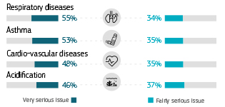 La mayoría de los europeos piensa que las condiciones de salud como las enfermedades respiratorias (89%), el asma (88%) y las enfermedades cardiovasculares son problemas graves en sus países como resultado de la contaminación del aire.