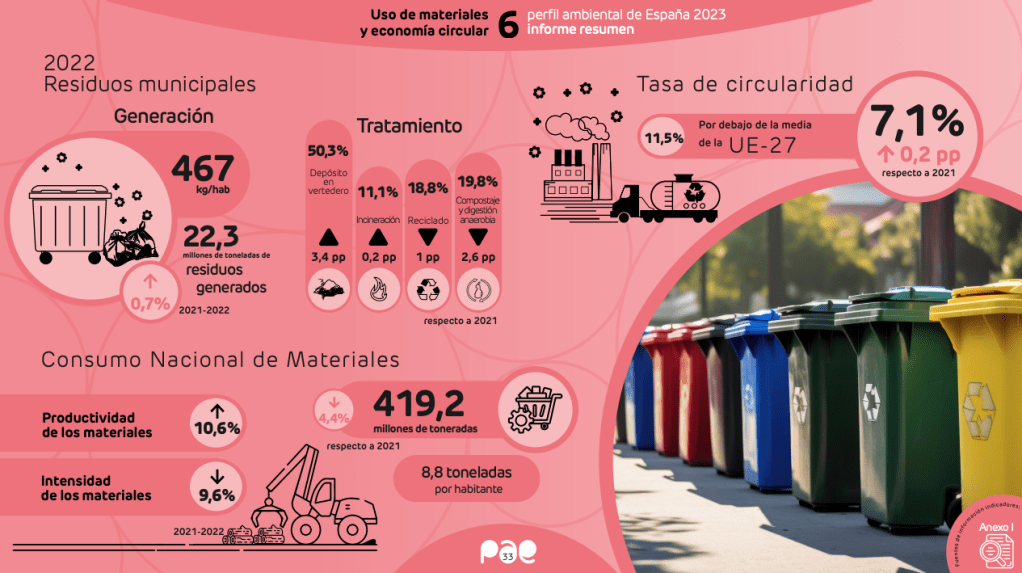 La pasada semana, el MITECO presentó el informe Perfil Ambiental de España 2023 (en algunos sectores, con datos de 2022). Es la recopilación anual de datos ambientales más extensa que se realiza en nuestro país y una radiografía completa del estado de la conservación de los espacios naturales (ecosistemas terrestres y marinos), la lucha contra el cambio climático y la adaptación a sus impactos, la economía circular y la gestión de los residuos, el estado de las masas forestales, etc.