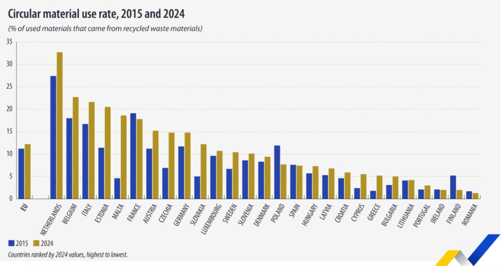 La tasa de circularidad aumentó 0,1 puntos porcentuales respecto a la tasa de 2023 y alcanzó así su valor más alto registrado nunca. Estos datos proceden de las últimas estadísticas publicadas por Eurostat sobre la utilización de materiales circulares.